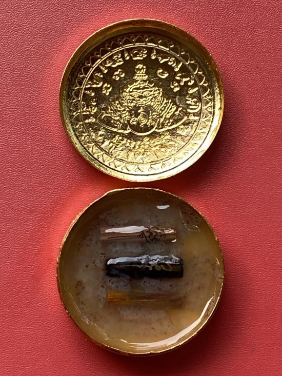 เคาะเดียวแดง สีผึ้งพระราหู รุ่น มงคลจักรวาล เนื้อ โลหะชุบทองลงยาสีดำขอบสีดำ ขนาด 5ซม |