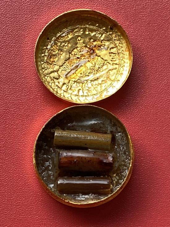 เคาะเดียวแดง สีผึ้งพระราหู รุ่น มงคลจักรวาล เนื้อ โลหะชุบทองลงยาสีดำขอบสีแดง ขนาด3.2ซม |