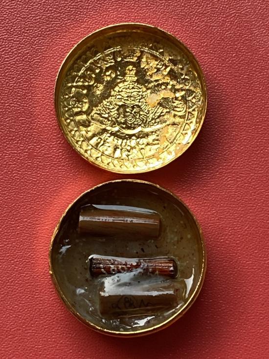 เคาะเดียวแดง สีผึ้งพระราหู รุ่น มงคลจักรวาล เนื้อ โลหะชุบทองลงยาสีดำขอบสีแดง ขนาด3.2ซม |