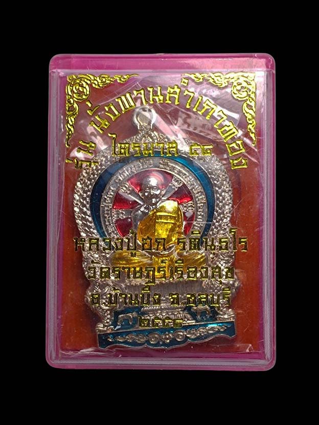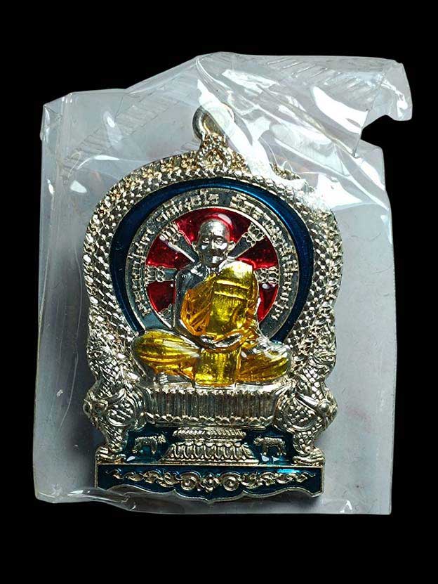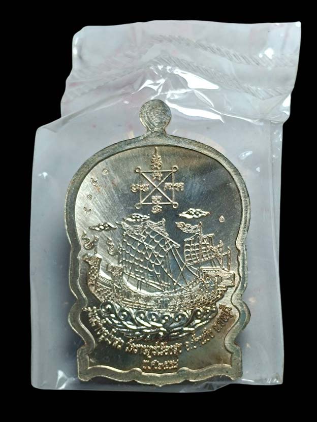 เหรียญนั่งพานสำเภาทอง หลวงปู่ฮก วัดราษฏร์เรืองสุข จ.ชลบุรี ปี พ.ศ.2558 เนื้ออาบเงิน ลงยาสี ตอกโค้ต หมายเลข 5141 ซีลเดิม พร้อมกล่อง ผิวสวยๆ |