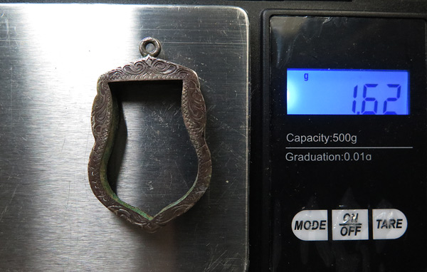 กรอบเงินแท้ทรงเสมาเก่า สภาพพอใช้ ไม่มีห่วง หนัก 1.62 กรัม |