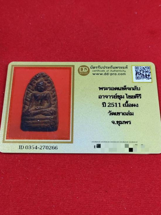 พระรอดเสด็จกลับ อาจารย์ชุ่ม ไชยคีรี เนื้อผง วัดเขาถล่ม ปี 2511 จ.ชุมพร พร้อมบัตรรับรอง |