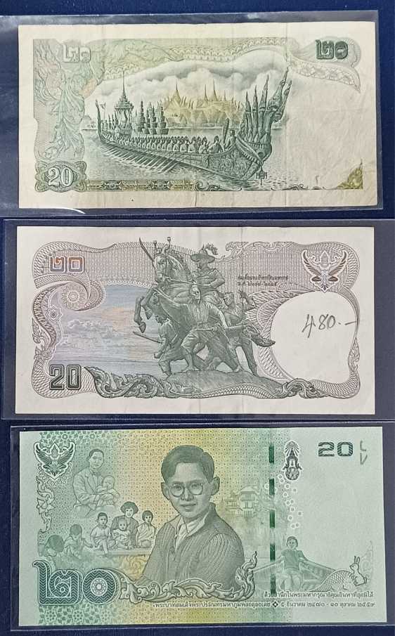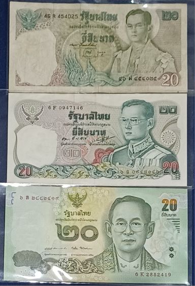 *** ธนบัตร ชนิด 20 บาท จำนวน 3 ฉบับ คละแบบ คละปี ในหลวงรัชกาลที่ 9 โรงพิมพ์ธนาคารแห่งประเทศไทย*** สภาพผ่านการใช้งาน 2 ฉบับ ไม่ผ่านการใช้งาน 1 ฉบับ*** |