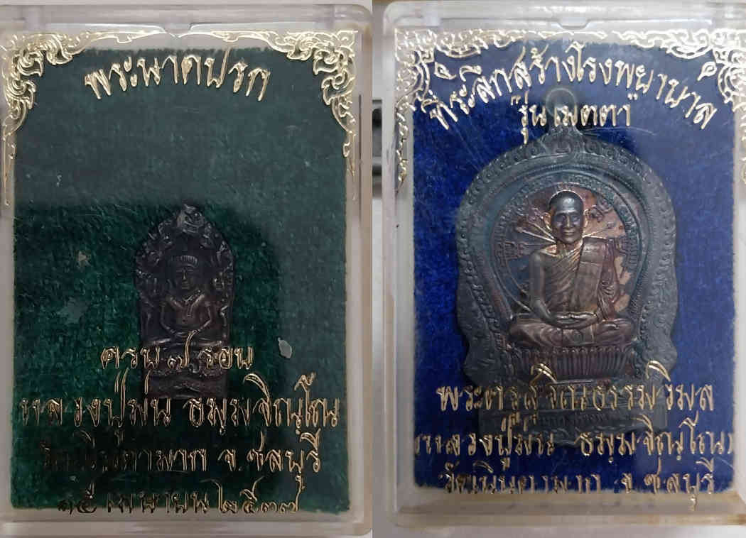 เหรียญนั่งพาน เนื้อเงิน + พระนาคปรก เนื้อเงิน หลวงปู่ม่น วัดเนินตามาก จ.ชลบุรี ปี2537 กล่องเดิมทั้ง2องค์ครับ |
