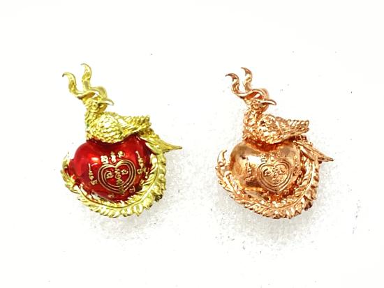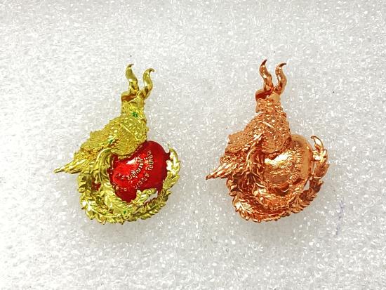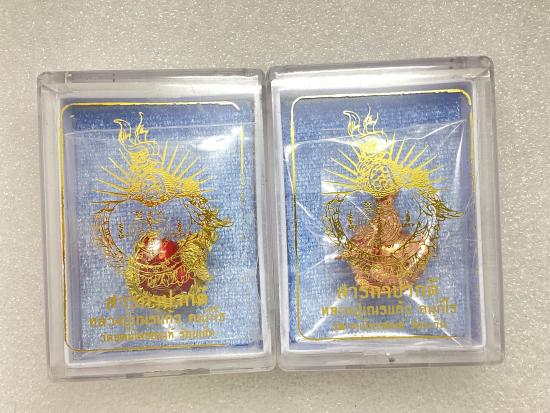 สาริกาปากดี หลวงปู่เณรแก้ว วัดอุดมไพรสณฑ์ จังหวัดร้อยเอ็ด เนื้อมหาชนวนลงยาแดง ,ทองแดง กล่องเดิม ( 2 ชิ้น)