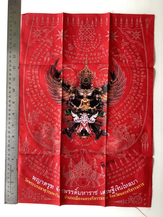 ผ้ายันต์ พญาครุฑ รุ่น เศรษฐีเงินไหลมา วัดพระศรีมหาธาตุวรมหาวิหาร จ.นครศรีธรรมราช สีแดง ขนาด A3 ขนาด 11.5 นิ้ว x 16.5 นิ้ว |