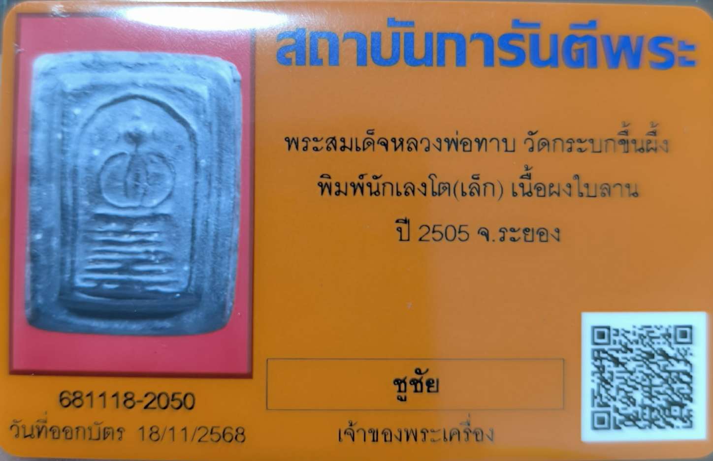 พระสมเด็จนักเลงโต พิมพ์เล็ก หลวงพ่อทาบ ปี2505 พร้อมบัตรฯ