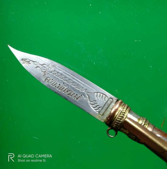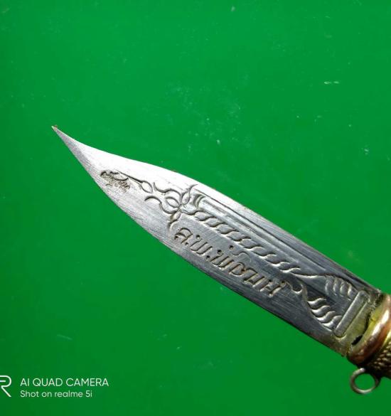 มีดสาริกาหลวงพ่อจารด้วยหมึกน้ำเงินความยาวพร้อมฝัก3นิ้วส่วนใบมีดนิ้วครึ่งปี2561ตอกโค้ต หลวงพ่อพัฒน์ วัดห้วยด้วน จ.นครสวรรค์ |
