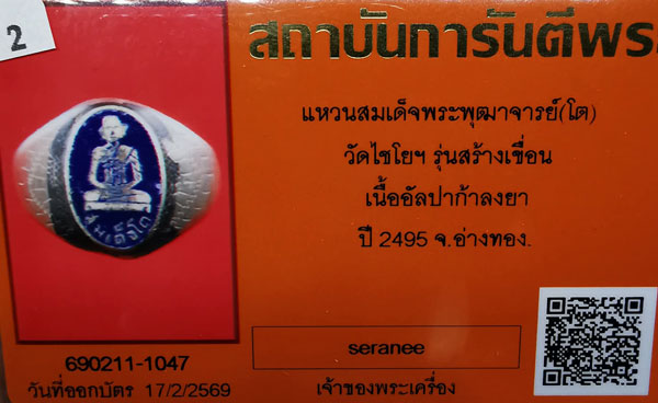 แหวนสมเด็จพระพุฒาจารย์(โต) วัดไชโยฯ รุ่นสร้างเขื่อน เนื้ออัลปาก้าลงยาสี ปี2495 จ.อ่างทอง + บัตรG-pra สภาพเดิมค่ะ |