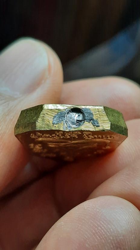 เหรียญปั๊ม หลังพระปิดตา หลวงพ่อเพชร วัดแจ้ง จ.ปราจีนบุรี ปี 2533 (เนื้อทองเหลือง ฐานฝังตะกรุด) |