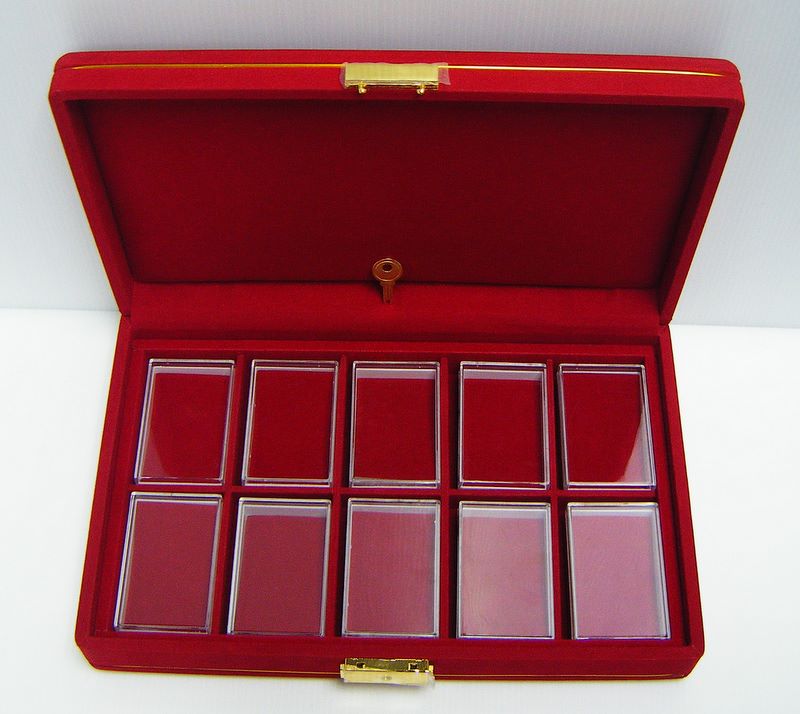 กล่องใส่พระแบบ 10ช่อง(รุ่นใหม่เอี่ยม) หุ้มกำมะหยี่สีแดง สวยหรู ใส่พระพร้อมกล่องพระประกวดได้เลยคะ พร้อมสามารถเก็บใส่เซฟธนาคารได้คะ มือ1ใหม่เอี่ยม นะคะ