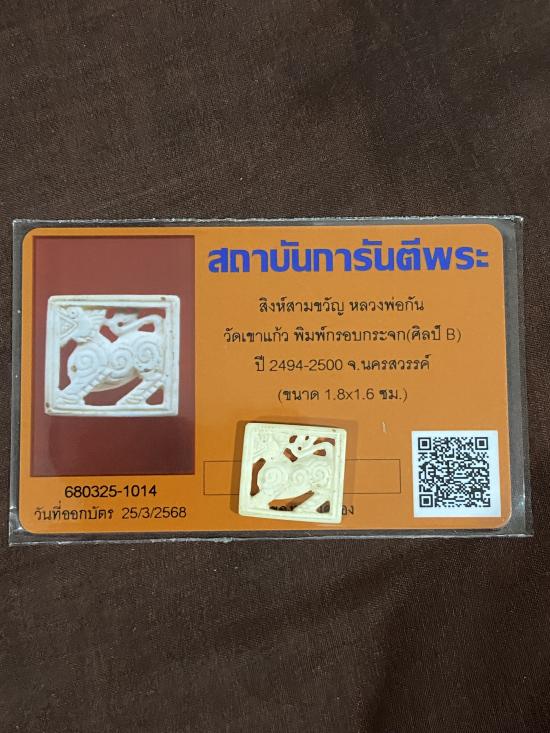 (เคาะเดียว 2,000 บ. )สิงห์สามขวัญ หลวงพ่อกัน วัดเขาแก้ว พิมพ์กรอบกระจก ปี 2494-2500 จ.นครสวรรค์ ขนาด 1.8x1.6 ซม สภาพสวยแห้งๆเดิมๆ พร้อมบัตรรับประกัน