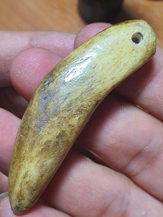 กระดูกเสือแกะเป็นรูปเขี้ยว สำหรับไว้ใช้ของคนสมัยโบราณ ขนาดประมาณ 6 cm