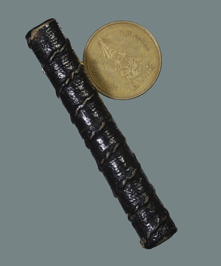 วัดใจ**เครื่องราง ตะกรุดกระดาษสาถักเชือก ลงรักดำเก่า ยาว 2.5นิ้ว.....ตามสภาพครับ |