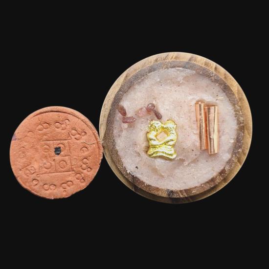 เคาะเดียวแดง พญายูงคำ รุ่นแรก เนื้อผงชาดปัดทอง และ ตลับไม้สีผึ้งเนื้อหอม รังผึ้งร้าง ขวางเดือนขวางตะวัน รุ่นแรก ฝังอิ่น ตะกรุด ในเมตตาบารมี เจ้าปู่จั่นต่า กาวิสาละ ครูบากฤษดา เมตตาเษก |