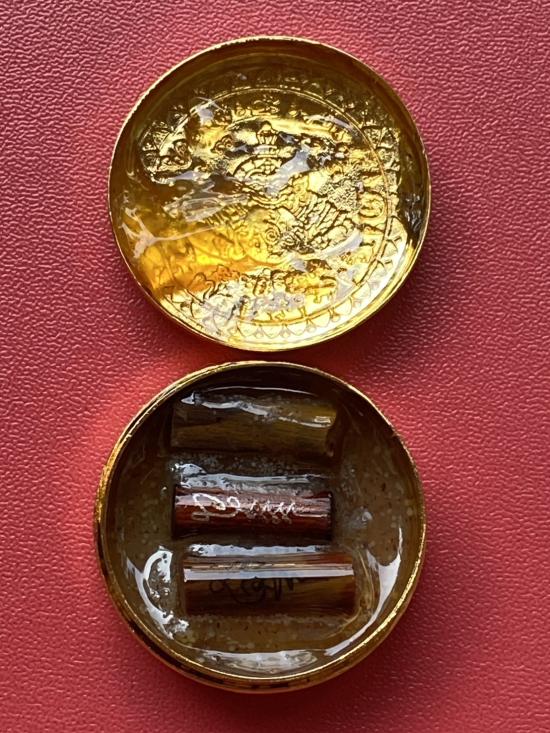 เคาะเดียวแดง สีผึ้งพระราหู รุ่น มงคลจักรวาล เนื้อ โลหะชุบทองลงยาสีดำขอบสีดำ ขนาด3.2ซม |