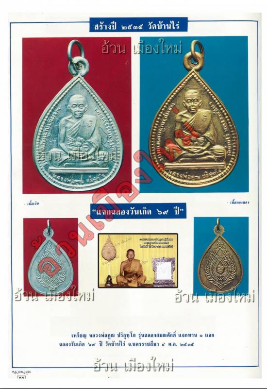 ++วัตถุประสงค์ : เนื่องในมหามงคลเฉลิมพระชนมพรรษา 5 รอบสมเด็จพระนางเจ้าสิริกิติ์ พระบรมราชินีนาถ ในวันที่ 12 สิงหาคม พ.ศ.2535 ทรงพระกรุณาโปรดเกล้า สถาปนาสมณศักดิ์พระเถระทั่วประเทศเป็นกรณีพิเศษในโอกาสนี้ หลวงพ่อคูณ ปริสุทฺโธ วัดบ้านไร่ ได้รับพระกรุณาโปรดเกล้าเลื่อนสมณศักดิ์ เป็นพระราชาคณะชั้นสามัญยก ฝ่ายวิปัสสนาธุระ ในราชทินนามที่ พระญาณวิทยาคมเถร ( สย.วิ. ) และคณะศิษย์ได้จัดทำเหรียญหลังพัดยศเพื่อ แจกทานครั้งที่ 1 ในวันครบรอบวันเกิด วันที่ 4 ตุลาคม พ.ศ .2535 ใน 2 วาระมงคล พร้อมๆกัน |