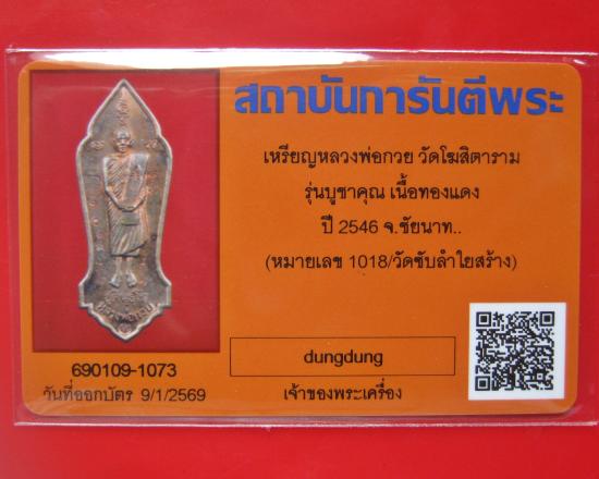 เหรียญหลวงพ่อกวย วัดโฆสิตาราม รุ่นบูชาคุณ เนื้อทองแดง ปี 2546 พร้อมบัตรรับรองพระแท้ หมายเลข 2886
