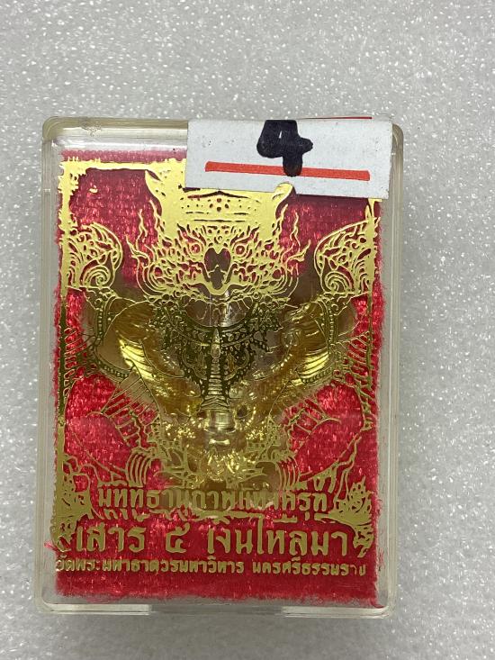พญาครุฑเสาร์ ๕ เงินไหลมา วัดพระมหาธาตุ วรมหาวิหาร จ.นครศรีธรรมราช สูง 2.5 ซ.ม. เนื้อทองระฆังศรัทธา กล่องเดิม ( แจกผู้ร่วมพิธีปลุเสก ) |
