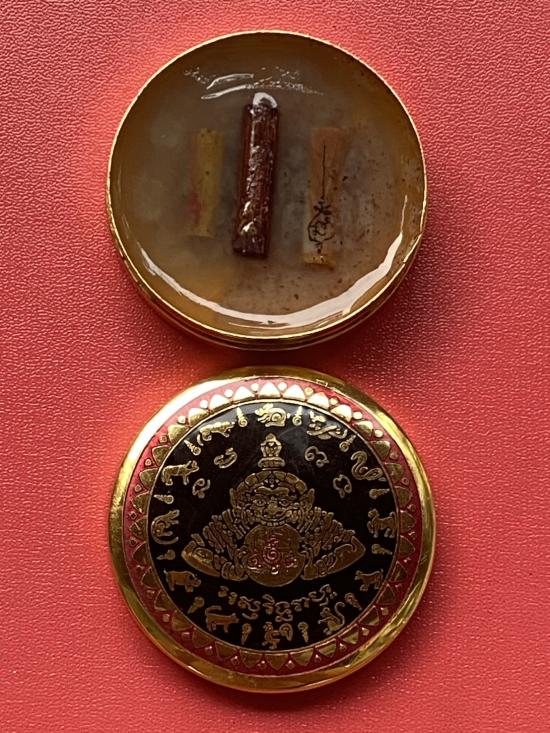เคาะเดียวแดง สีผึ้งพระราหู รุ่น มงคลจักรวาล เนื้อ โลหะชุบทองลงยาสีดำขอบสีแดง ขนาด 5ซม |