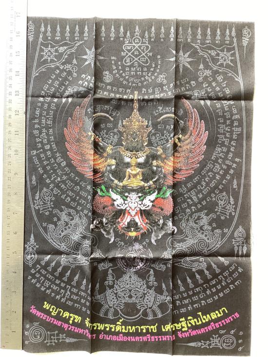ผ้ายันต์ พญาครุฑ รุ่น เศรษฐีเงินไหลมา วัดพระศรีมหาธาตุวรมหาวิหาร จ.นครศรีธรรมราช สีดำ ขนาด A3 ขนาด 11.5 นิ้ว x 16.5 นิ้ว |