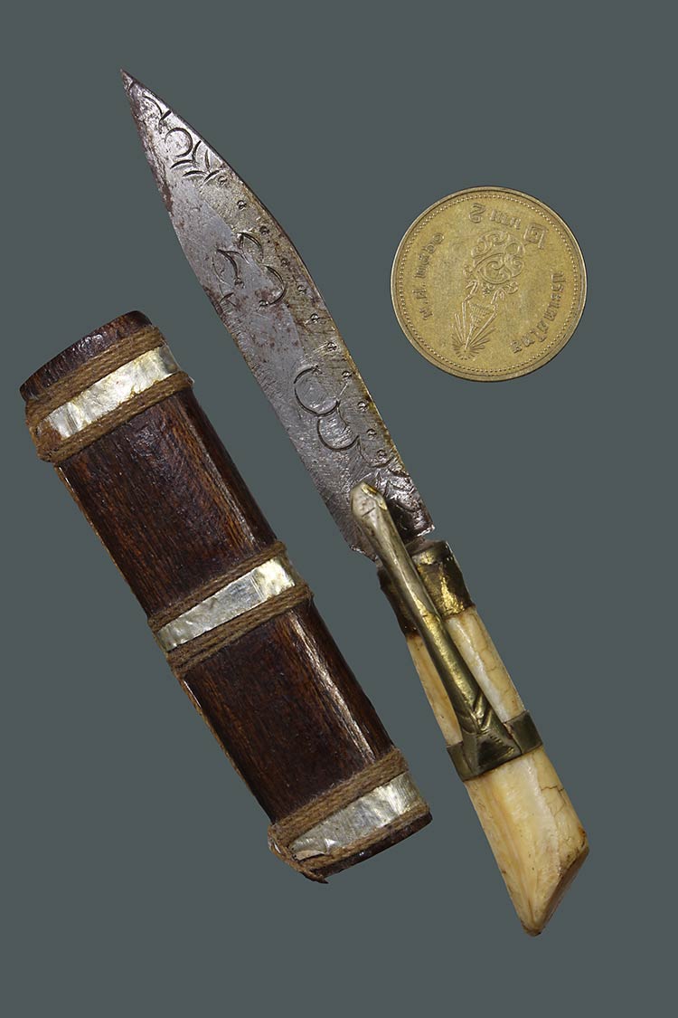 วัดใจ**เครื่องราง มีดหมอ ใบเหล็ก ตอกนะ ฝักไม้ ด้ามเนื้อคตงาเก่า *(ด้ามใส่มาใหม่)* ยาว 4.5 นิ้ว ..หายาก...ตามสภาพครับ