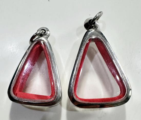 ตลับมือสองสแตนเลสทรงสามเหลี่ยมใส่เหรียญหลวงพ่อเงินปี 15 ได้ 2 ใบแบบเปิดหน้า-หลังขนาด 3 x 2 ซม. |