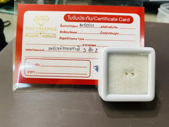 เพชรแท้ธรรมชาติ เหลี่ยมเบลเยี่ยมคัต แกะจากตัวเรือนสินหลุดจำนำ จำนวน 2 เม็ด น้ำหนักรวม 0.06 กะรัต น้ำประมาณ 94 SI-VS2 |