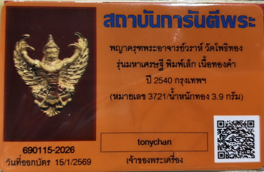 พญาครุฑพระอาจารย์วราห์ วัดโพธิทอง รุ่นมหาเศรษฐี พิมพ์เล็ก เนื้อทองคำ ปี 2540