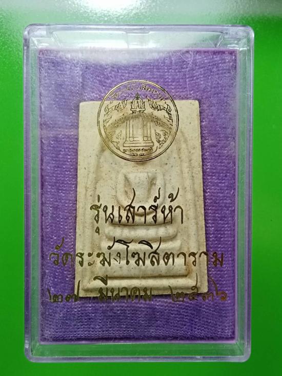 พระสมเด็จเสาร์ห้ารุ่นแรก ปี 2536 พิธีพุทธาภิเษกอันยิ่งใหญ่ 27 มีนาคม 2536 พร้อมกล่องเดิม พระสภาพสวยเดิมคากล่อง ตรายางไม่ชัดเกิดจากการปั้มในขณะที่เนื้อพระยังมีความชื้นจัด หมึกเลยลบเลือนออกไป แต่ด้านหน้ามีคราบสีผึ้งชัดเจน รับประกันพระแท้ตามกฏ