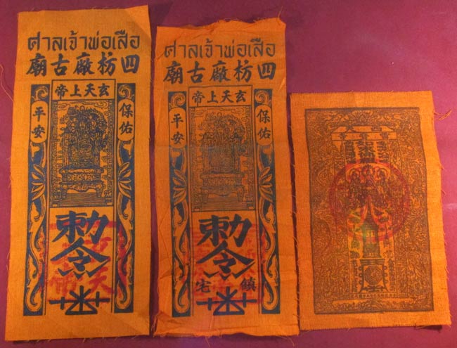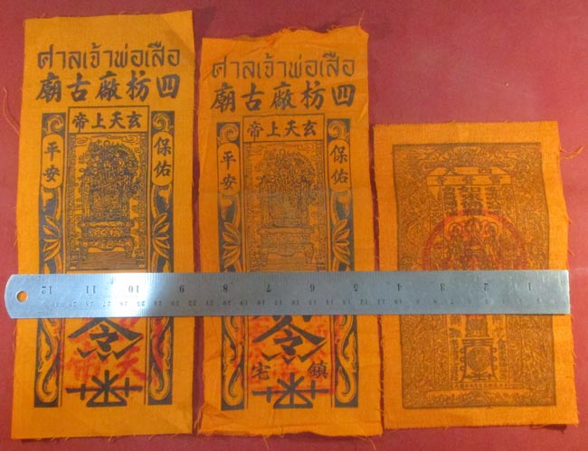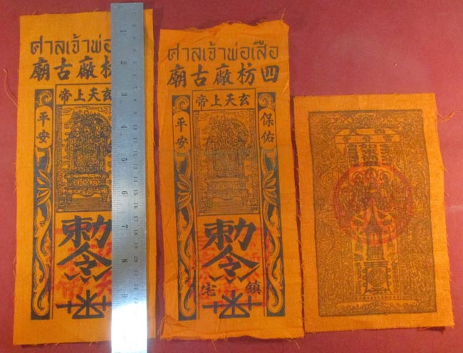 ผ้ายันต์ ศาลเจ้าพ่อเสือ กับ ผ้ายันต์จีน ไม่ทราบ ครับ (ให้บูชาพร้อมกันทั้ง 3 ผืน ครับ) |