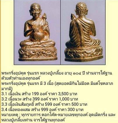พระอุปคุต รุ่นเลื่อนสมณศักดิ์ หลวงปู่เกลี้ยง เตชธมโม วัดโนนแกด จ.ศรีสะเกษ สุดยอดมีกินไม่มีอด มีแต่โชดลาภมากมี เลื่อนฐานะเป็นเศรษฐีมหาเศรษฐี องค์นี้เนื้อทองผสม#425 มีจารก้นทุกเนื้อ มี 4 เนื้อ