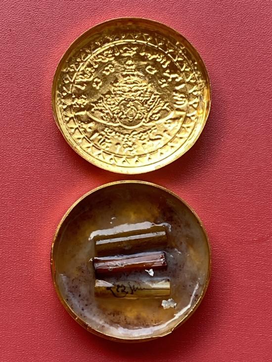 เคาะเดียวแดง สีผึ้งพระราหู รุ่น มงคลจักรวาล เนื้อ โลหะชุบทองลงยาสีดำขอบสีแดง ขนาด 5ซม |