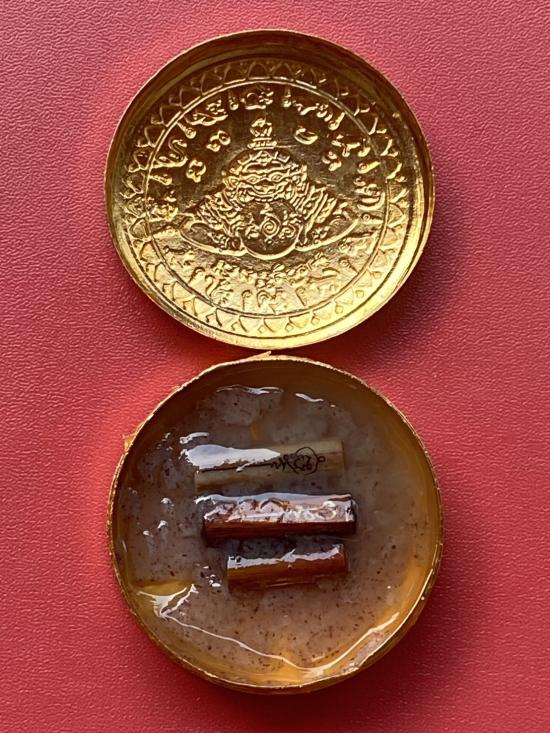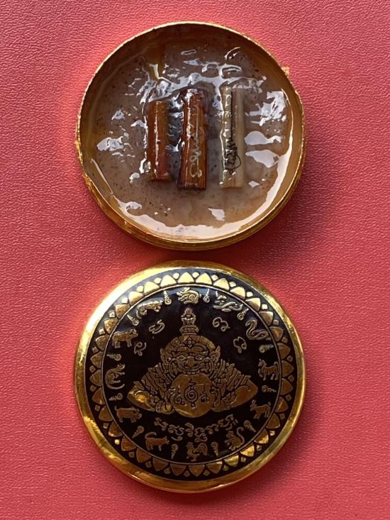 เคาะเดียวแดง สีผึ้งพระราหู รุ่น มงคลจักรวาล เนื้อ โลหะชุบทองลงยาสีดำขอบสีดำ ขนาด 5ซม |
