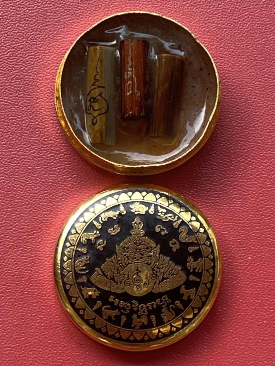 เคาะเดียวแดง สีผึ้งพระราหู รุ่น มงคลจักรวาล เนื้อ โลหะชุบทองลงยาสีดำขอบสีดำ ขนาด3.2ซม |