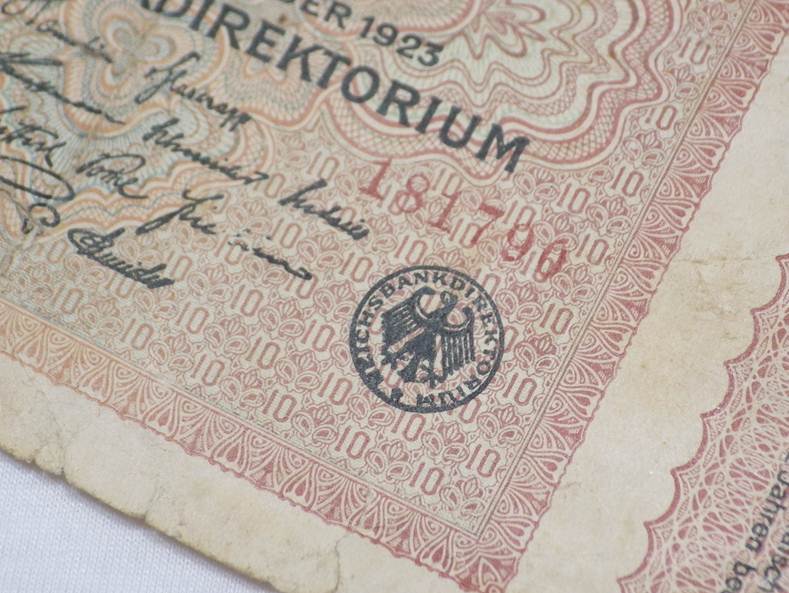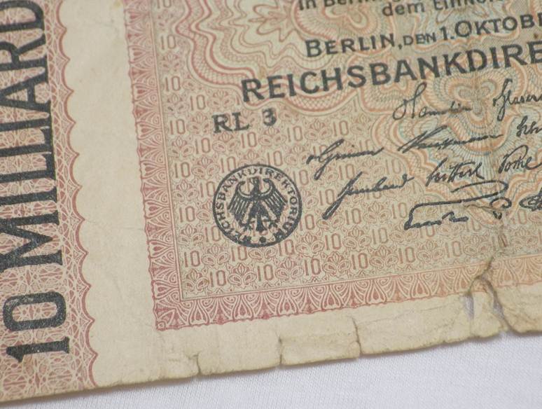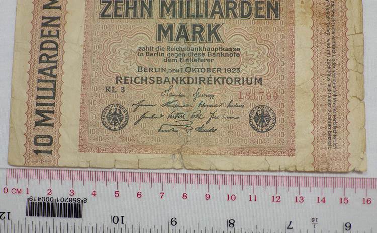 ธนบัตร10,000,000,000 Mark (10 พันล้านมาร์ก)ธนัตรเก่าของประเทศเยอรมนี ปีค.ศ. 1923 (พ.ศ. 2466) สภาพตามรูปครับ เคาะแรกแดง 100.-