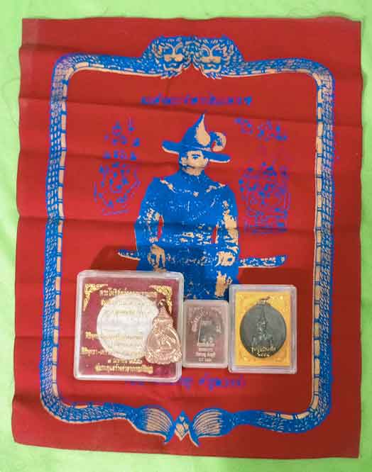 พระผงสมเด็จพระนเรศวรมหาราช + เหรียญ 2 เหรียญ + ผ้ายันต์ สมเด็จพระเจ้าตากสินมหาราช + เหรียญสมเด็จพระนารายณ์มหาราช รุ่นปูนบำเหน็จ |