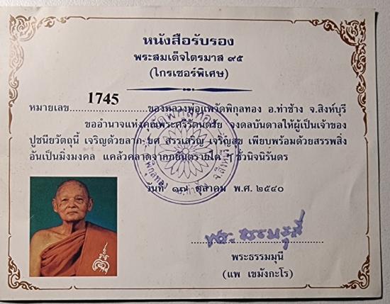 พระสมเด็จ หลวงพ่อแพ วัดพิกุลทอง รุ่นไตรมาส ๙๕ (ไกรเซอร์พิเศษ) ปี 2540 เนื้อผง ฝังตะกรุดทองคำ 3 ดอก |