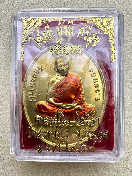 เหรียญเจริญพรบน รุ่นโชคดี มั่งมี ศรีสุข เนื้อทองฝาบาตรลงยาจีวร หมายเลข 15676 หลวงปู่ทิม วัดละหารไร่ จ.ระยองปี58 พร้อมกล่อง |