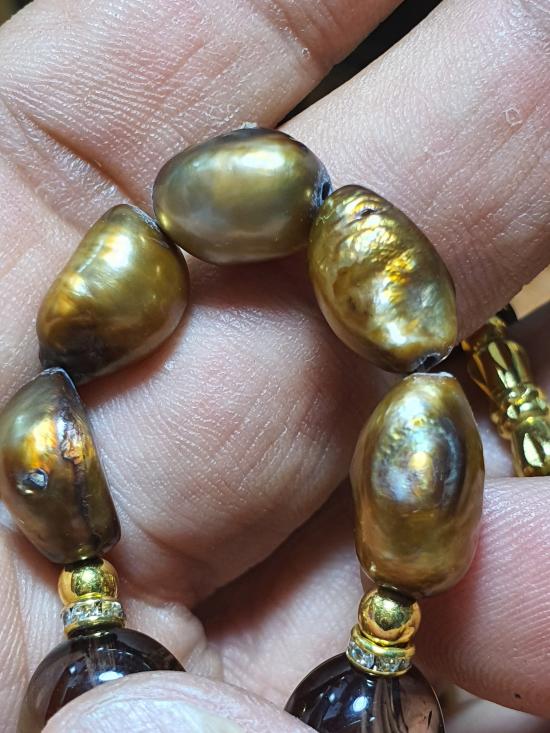 สร้อยไข่มุกน้ำจืดร้อยคั่นด้วยหินใสสีอำพันเหลืองยาว 18นิ้ว |