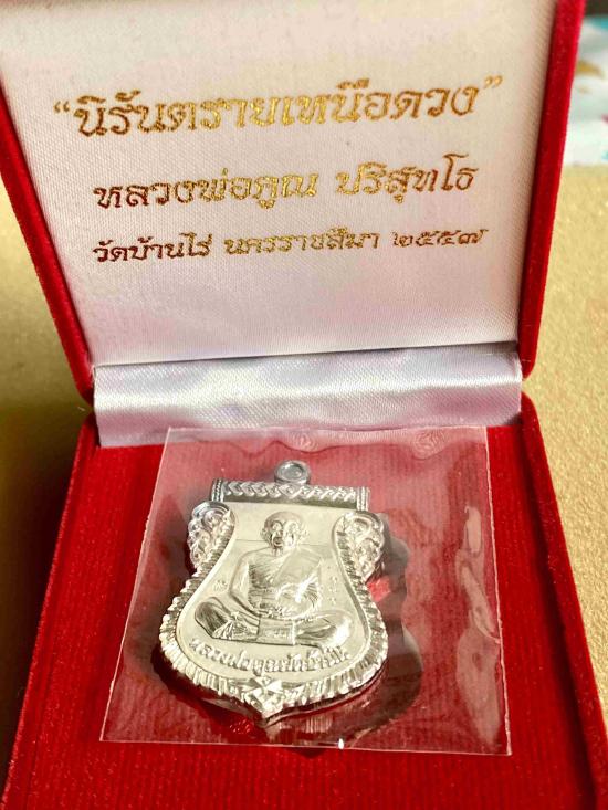 เหรียญเสมาหลวงพ่อคูณ ปริสุทโธ รุ่น นิรันตรายเหนือดวง ออกวัดบ้านไร่ ปี 57 เนื้อเงิน หมายเลข858 พร้อมกล่องเดิม |