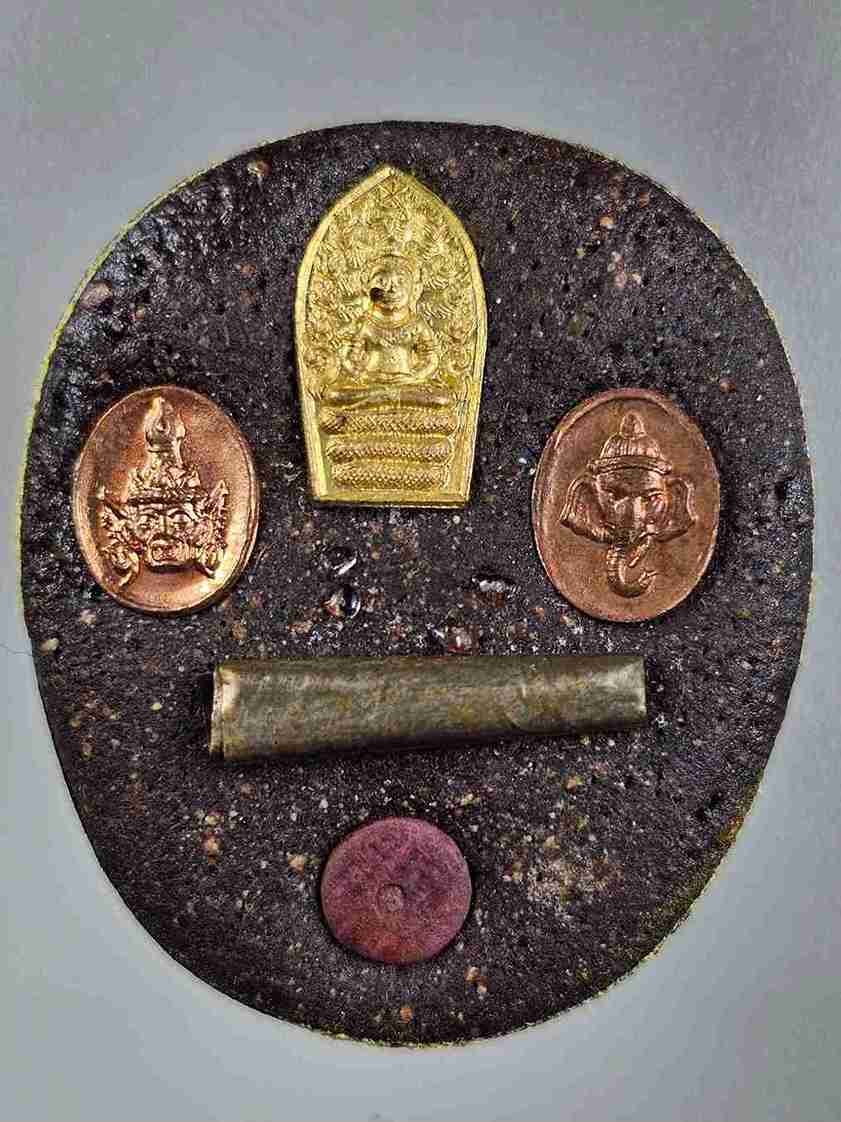 หลังบรรจุผงวิเศษ ๓ ชนิด , พระธาตุ , พระปรกในมะขาม รุ่นแรก ตะกรุดเงินนารายณ์ถอดรูป ๑ ดอก เศียรฤาษี , เศียรพระพิฆเนศ , เม็ดโค๊ตทองแดง มีหมายเลขกำกับ สร้าง ๒๙๙ องค์ สุดยอดอีกหนึ่งของ หลวงพ่อชำนาญ วัดบางกุฎีทอง สวยเดิม ไม่ได้ใช้ พร้อมกล่อง