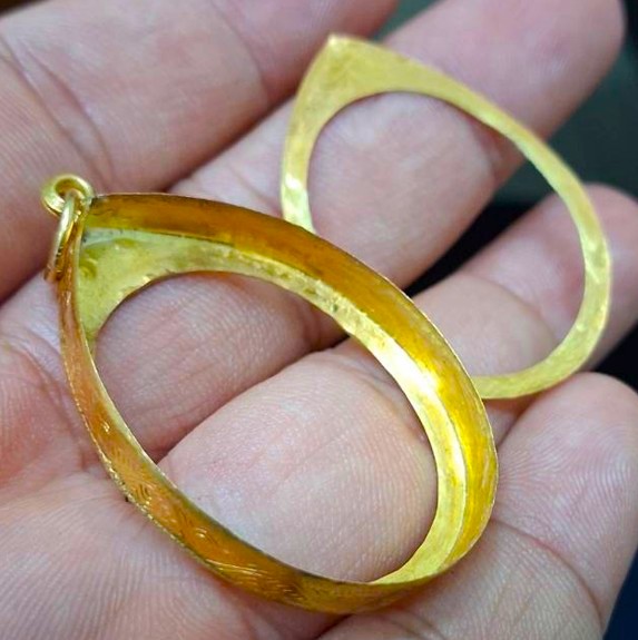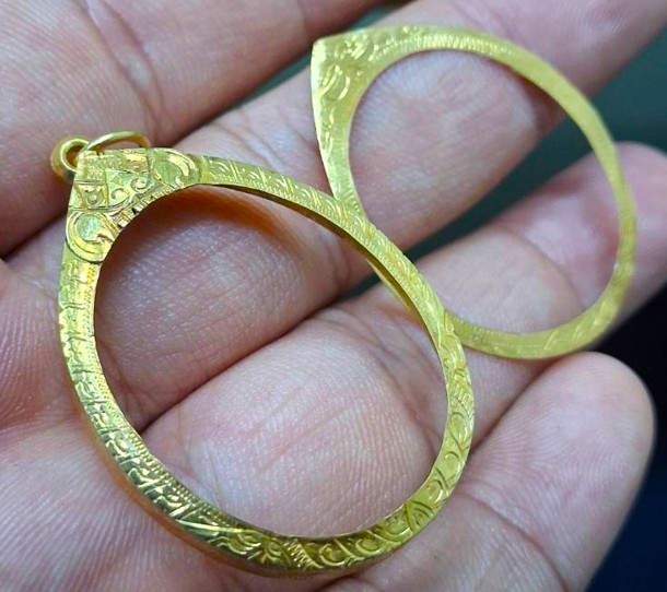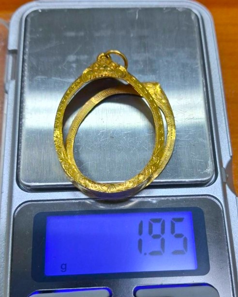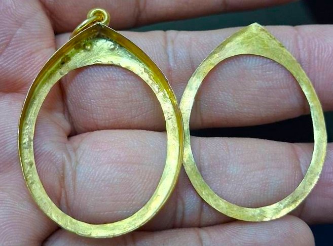 กรอบทองมือสอง ใส่เหรียญหลวงปู่ทวดรุ่น2,4 และเหรียญรูปไข่ทั่วไปที่ไกล้เคียง หน้าจอกว้าง 2.35 ซม., สูง 2.90 ซม. น้ำหนัก 1.95 กรัม เคาะเดียว