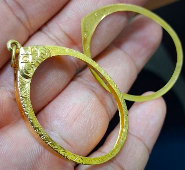 กรอบทองมือสอง ใส่เหรียญเจริญพรหลวงพ่อคูณ , เหรียญเจริญพร+นาคปรกหลวงปู่ทิม และเหรียญรูปไข่ทั่วไปที่ไกล้เคียง หน้าจอกว้าง 2.60 ซม., สูง 3.35 ซม. น้ำหนัก 1.73 กรัม เคาะเดียว