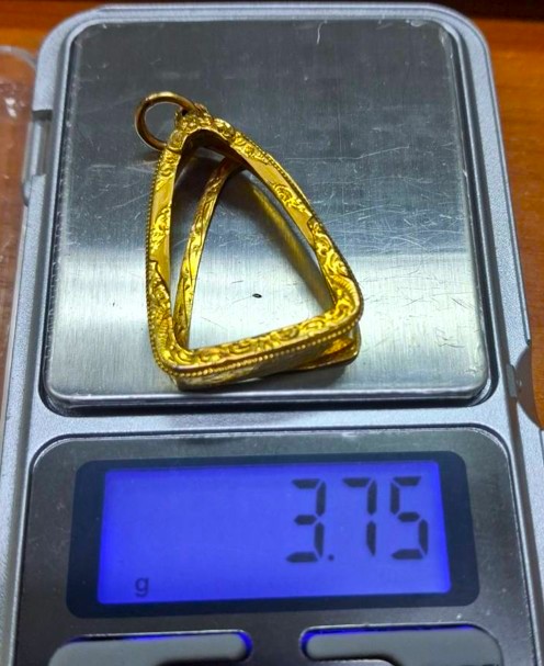 กรอบทองมือสอง ใส่พระกริ่ง พระชัย รูปหล่อ เนื้อดิน หรืออื่นๆทั่วไปที่ไกล้เคียง หน้าจอกว้าง 1.8 ซม., สูง 2.7 ซม. น้ำหนัก 3.75 กรัม เคาะเดียว