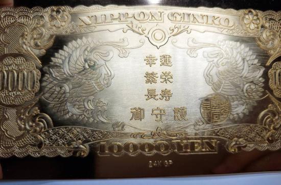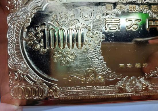 แผ่นธนบัตร เงินญี่ปุ่น ทองคำ งาน24k GP 10000 yen งานเก่า ปี 1972 ชุบทองคำ 99% |