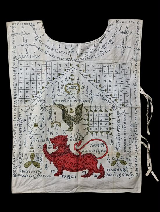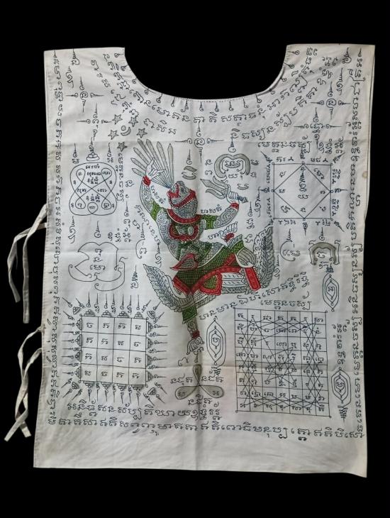 เสื้อยันต์หนุมานหาวเป็นดาวเป็นเดือน หลวงพ่อกวย วัดโฆสิตาราม จ.ชัยนาท ฝังลูกนิมิต ปี 2521 สีขาว หายาก สวยครับ |