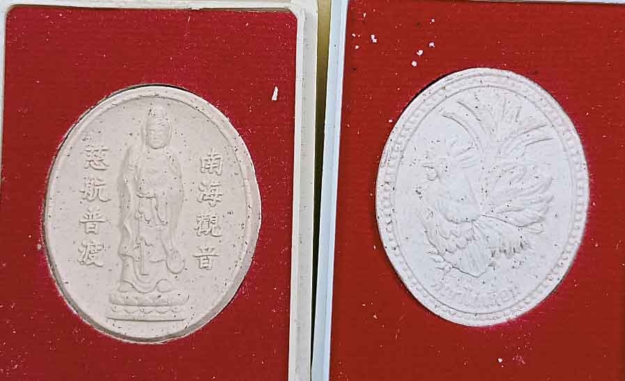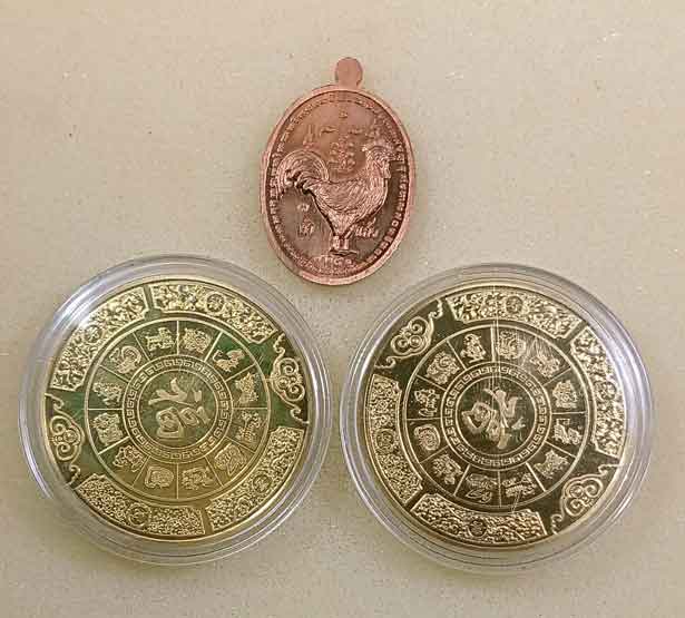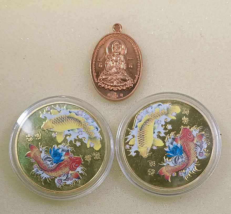 เหรียญ+พระผงเจ้าแม่กวนอิม + ผงพญาไ่ก่เรียกทรัพย์ บูชาดาว ปี 60 + เหรียญกลมโชคดี รูปปลาคราฟ 2 เหรียญ |