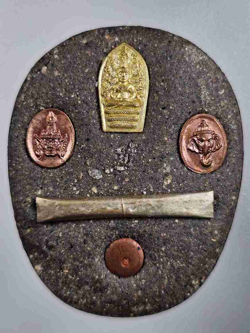 หลังบรรจุผงวิเศษ ๓ ชนิด , พระธาตุ , พระปรกในมะขาม รุ่นแรก ตะกรุดเงินนารายณ์ถอดรูป ๑ ดอก เศียรฤาษี , เศียรพระพิฆเนศ , เม็ดโค๊ตทองแดง มีหมายเลขกำกับ สร้าง ๒๙๙ องค์ สุดยอดอีกหนึ่งของ หลวงพ่อชำนาญ วัดบางกุฎีทอง สวยเดิม ไม่ได้ใช้ พร้อมกล่อง