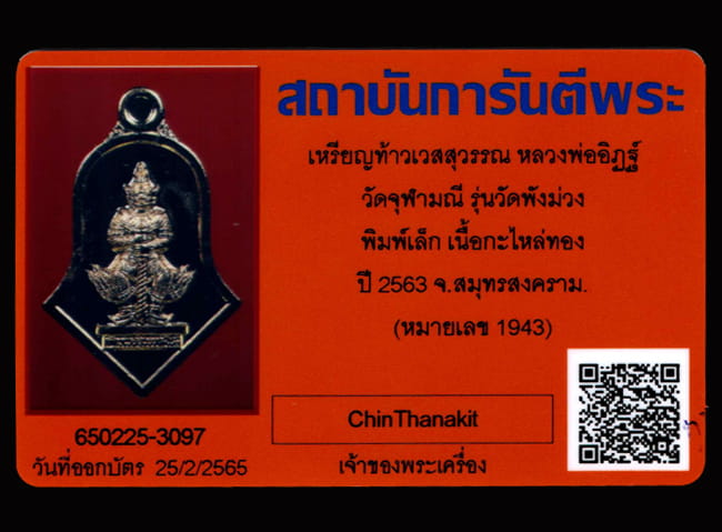 เหรียญท้าวเวสสุวรรณ วัดจุฬามณี รุ่นทวาราวดีศรีสุพรรณภูมิ พิมพ์เล็ก หลวงพ่ออิฏฐ์ สร้างถวายวัดพังม่วง พร้อมบัตรรับรอง QR-Code |